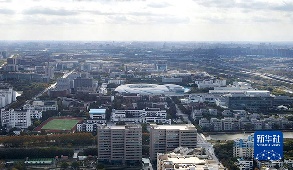 这是2023年11月25日在上海浦东新区张江科学城拍摄的形如鹦鹉螺的大科学装置上海光源(中)(无人机照片)。新华社记者 方喆 摄