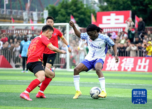 5月1日,非洲利比里亚社联足球队球员(右)与辽宁东港草莓足球队球员在比赛中拼抢。新华社发(王炳真 摄)
