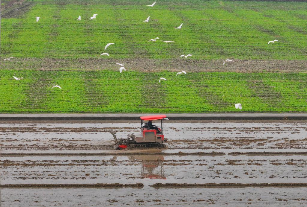 2025年2月25日,在浙江省瑞安市马屿镇儒阳村,农机在田间犁地,白鹭低空而飞(无人机照片)。