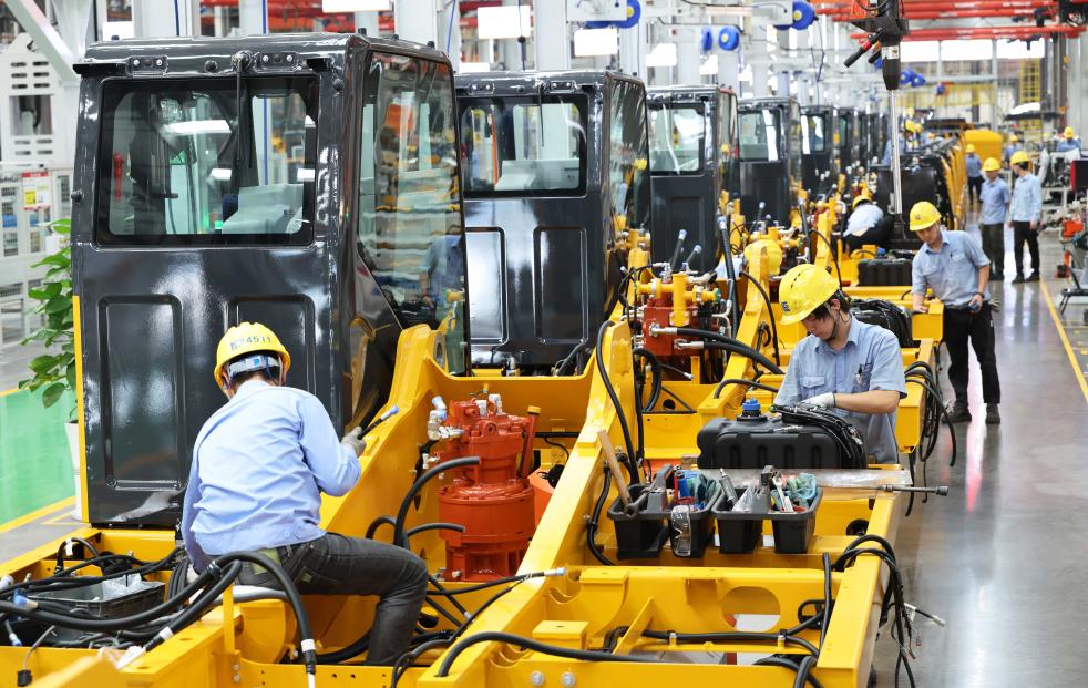 这是在广西柳州市柳工挖掘机智慧工厂拍摄的挖掘机上部机构件组装线(2024年11月12日摄)。
