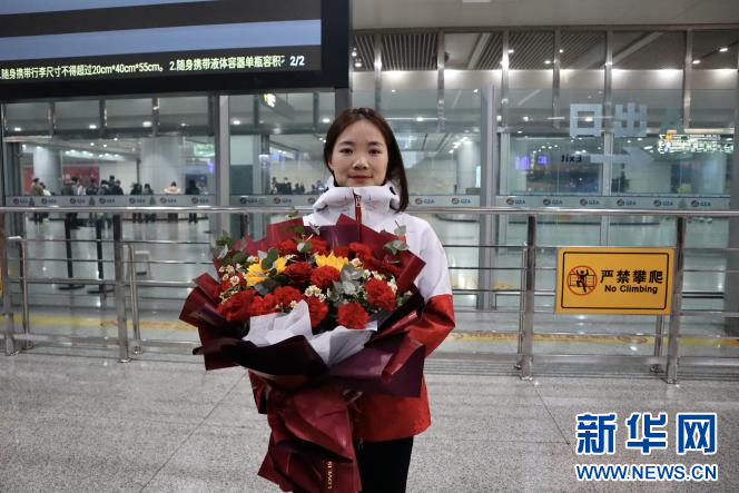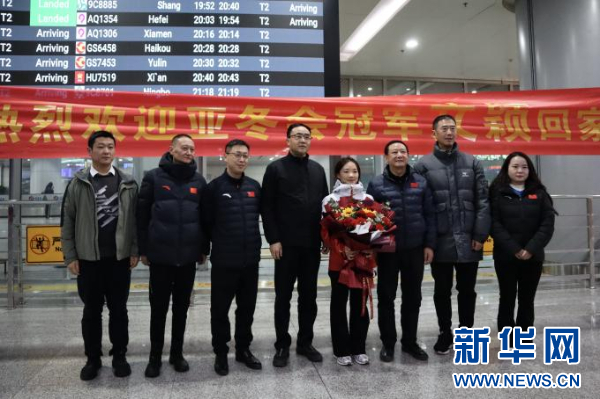 新华网贵阳3月6日电 3月5日,亚冬会冠军文颖回到贵州。在贵阳龙洞堡国际机场,接机人员用鲜花、掌声和欢呼声表示热烈的欢迎。