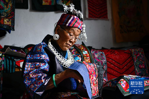在贵州省台江县萃文街道仰黎坊,苗绣传承人潘玉珍在刺绣。新华社记者 杨文斌 摄