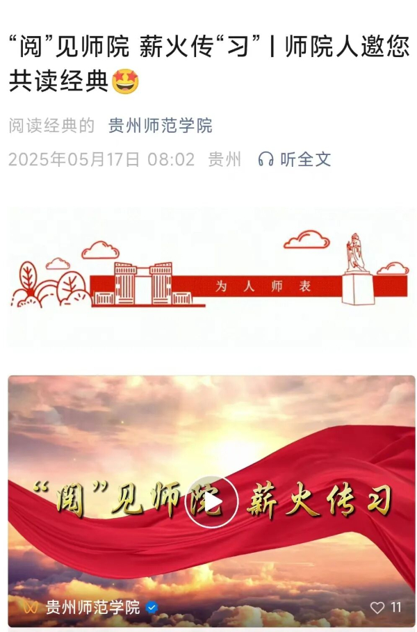 理论学习体系化建设有成效。健全理论学习常态化长效化制度机制,落实好党委理论学习中心组学习制度,实施“四学联动”模式,创新开展“现场观摩+理论学习+交流研讨”三维学习模式,积极开展各类集中学习、校际联合学习、专题研讨、经验交流,推动理论武装与事业发展双促进。理论研究与课程建设有突破。依托教育部大中小学思政课一体化建设共同体贵州省牵头单位、贵州省大中小学思政课一体化发展研究中心等平台,深化对党的创新理论研究阐释,构建“AI+思政”“VR+实践”教学矩阵,自主开发“黎平会议”“贵州乡村振兴生动实践”等教学资源,牵头完成“遵义会议精神永放光芒”大中小各学段课程资源并上报教育部;近5年我校教职工在中央、省级主流媒体发表理论文章百余篇;立项省部级以上思政类科研和教学示范类项目共计16项;全省首家名辅导员工作室——丽琼工作室入选2025年度高校思想政治工作质量提升综合改革与精品建设项目。理论传播矩阵构建有创新。聚力打造基层理论宣讲矩阵,采取领导干部带头讲、博士教授专题讲、党员同志主动讲、师院青年研习讲四级宣讲和“理论宣传二人讲”模式,推出“理”响新征程、阅见师院·薪火传“习”等特色理论宣传栏目,有效推动党的创新理论在校园落地生根,引导广大师生在学思践悟中坚定理想信念。