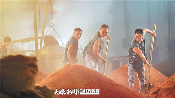 国威酒业生产车间内,工人正在下沙。卢世容 摄