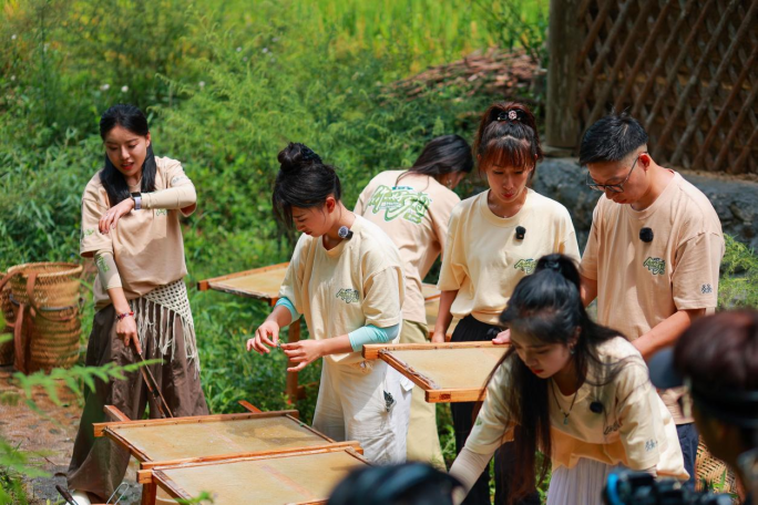 此外,节目还关注到了当地的瑶族制香、传统造纸工艺等非遗项目。在高华瑶寨的制香工坊里,62 岁的瑶族制香传承人赵大哥正端坐于木桌前,手持竹签,展示着传承三百年的古法制香技艺。他将竹签蘸上山泉水,再滚上一层用百年水碓碾出的天然树皮香粉,反复沾取均匀,香体逐渐密实如木。“我们瑶香靠的是树皮遇水自黏的天性,不加一滴胶水。”赵大哥一边操作一边向体验官们讲解,“寨里祭祀、节庆都离不开它。” 体验官们也学着赵大哥的样子,挽起袖子尝试蘸水、滚粉,虽然一开始香粉频频散落,但在赵大哥的耐心指导下,渐渐掌握了技巧,成功做出了第一把扎实的瑶族传统香。节目组用特写镜头记录下香粉在竹签间层层包裹的细节,让观众直观感受这项古老技艺的温度与智慧。