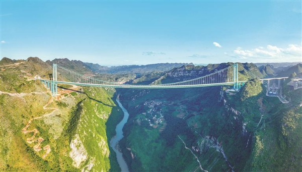 安顺市关岭自治县与黔西南州贞丰县之间,一座超大跨径钢桁梁悬索桥如钢铁巨龙般凌空飞架,桥塔高耸入云,缆索纵横交织。科技赋能,天堑变通途,镌刻着“中国制造”与“贵州智慧”科技丰碑的六安高速花江峡谷大桥通车后,昔日两小时的艰难跋涉,将缩短为仅需两分钟的车程。