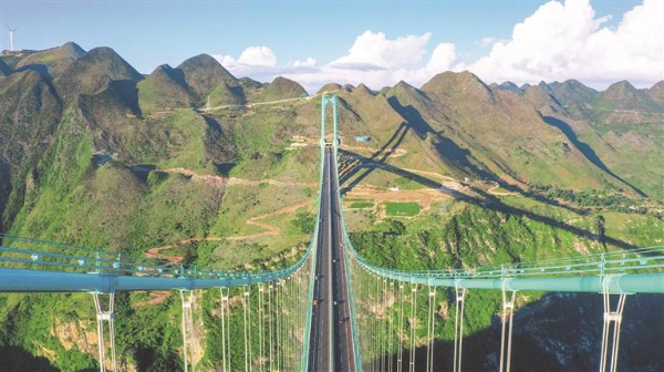 花江峡谷大桥全长2890米,主桥跨径1420米,桥面至水面高度625米,创造了桥梁主跨跨径山区最大、桥面至水面高度世界最高等多项世界纪录,对完善我省西部交通网络、推动产业融合、促进区域经济发展具有重要意义。